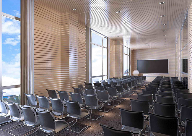 在大中型會議室內(nèi)部控制的難度是低頻混響時間混響由于觀眾廳座椅,毯窗戶和門窗簾,大多數(shù)建材是在高頻范圍內(nèi)顯示出其較好的吸聲性能。因此如無有效的聲學處理的低頻率,將勢必造成低頻混響時間過長影響語言清晰度。