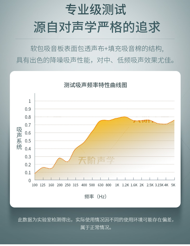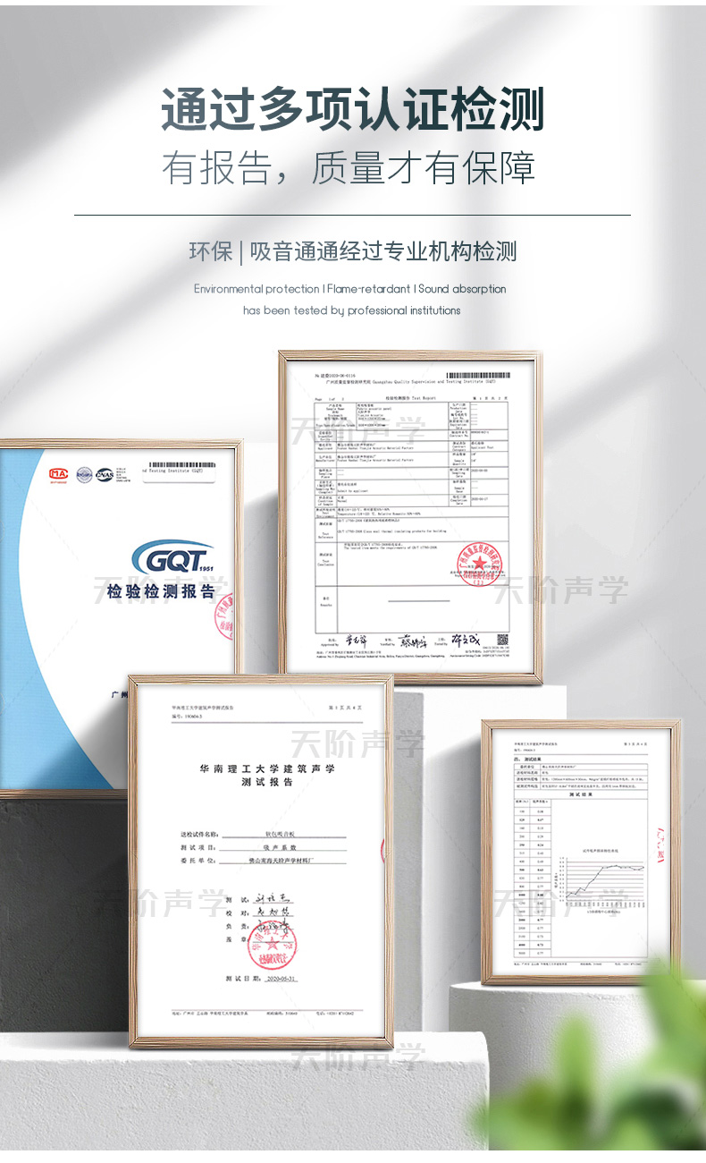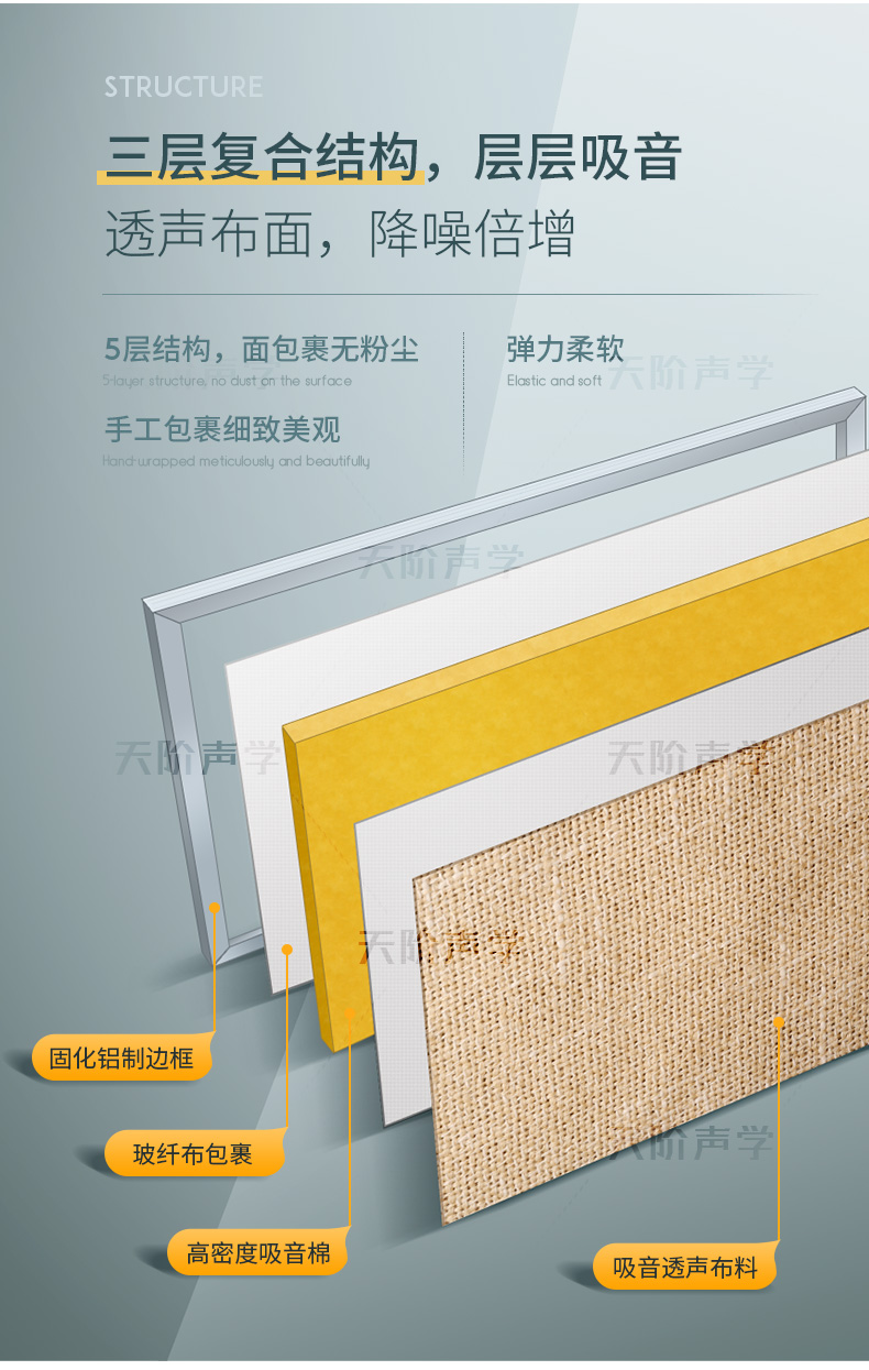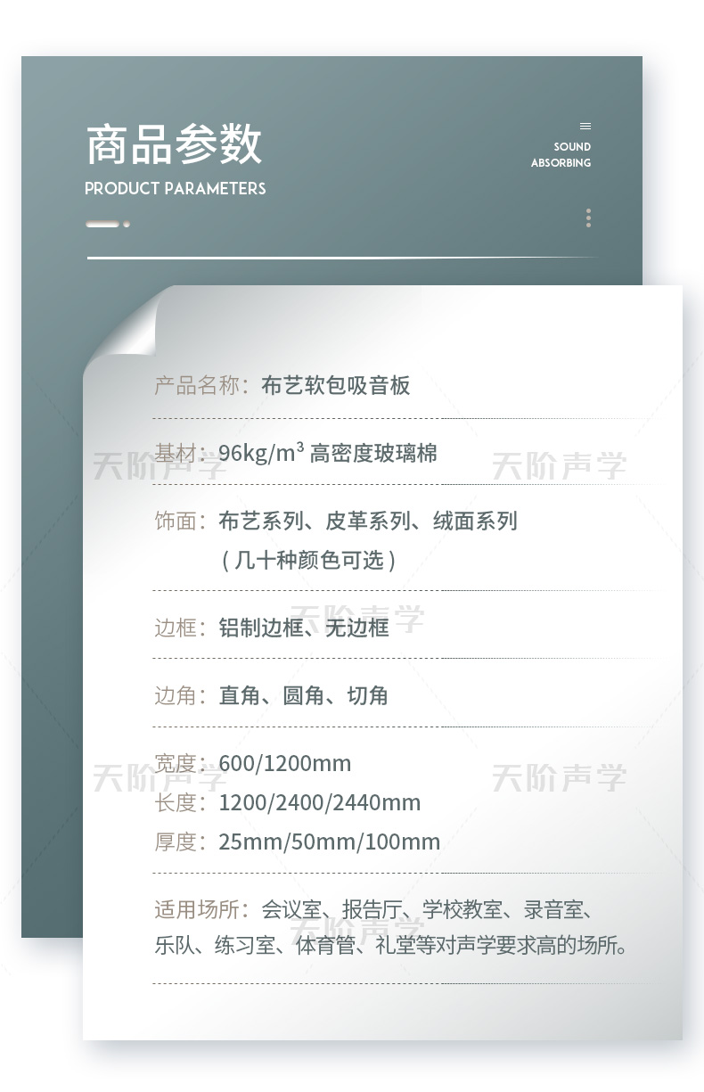 天階聲學(xué)布藝吸聲板采用高質(zhì)的96kg/m3玻璃吸音棉。具有環(huán)保、阻燃、吸聲頻帶寬、裝飾性強(qiáng)、施工簡單、無粉塵污染等性能,飾面顏色及材料選擇性廣,能很好地滿足客戶多樣化的聲學(xué)及裝飾需求。